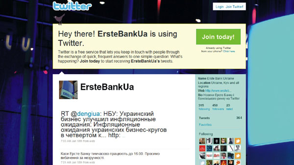 Началась твитеромания. Сразу несколько украинских финансовых институтов появились на «твитере». Пока их посты похожи на переписку сотрудников департаментов IT и маркетинга между собой. Ясно что работают в тестовом режиме, и скорее всего, пытаются понять нужно ли оно им. С официальных сайтов перехода на «тритер» пока не делают. Так вот, щебечут втихаря.