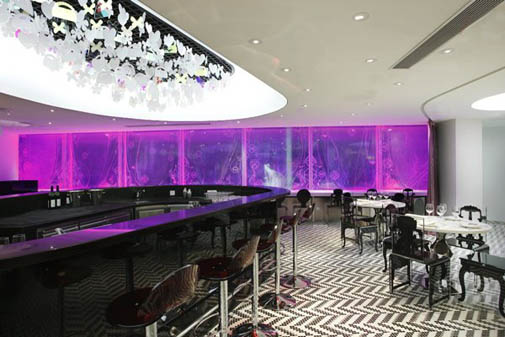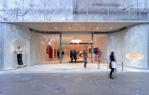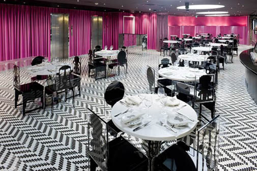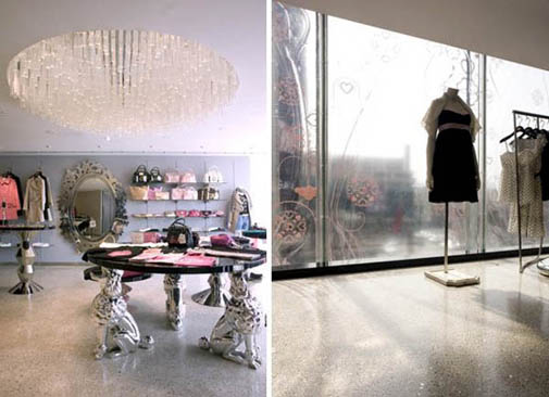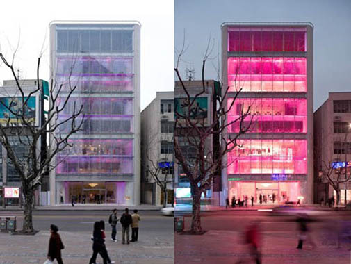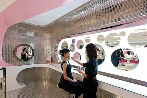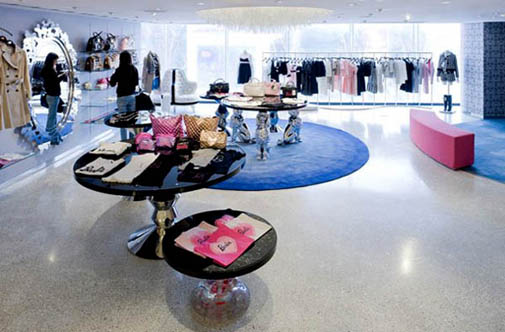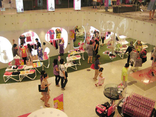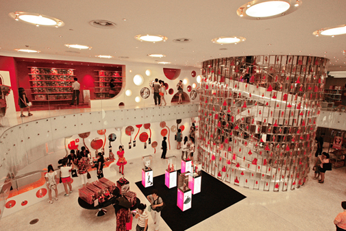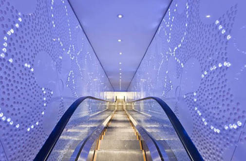 Розовый эскалатор засасывает клиентов на двух- уровневое торговое пространство.