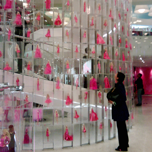 Трех- этажная винтовая лестница, окутана прозрачной стеной с 800 куклами Barbie, рассказывая хронологию развития бренда