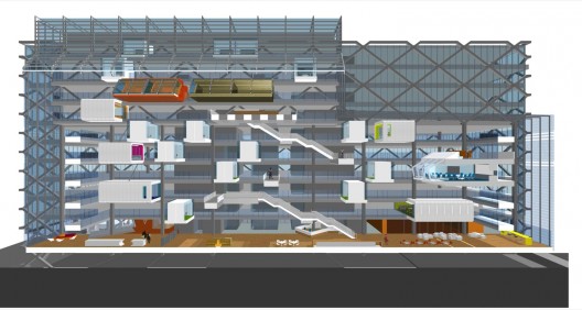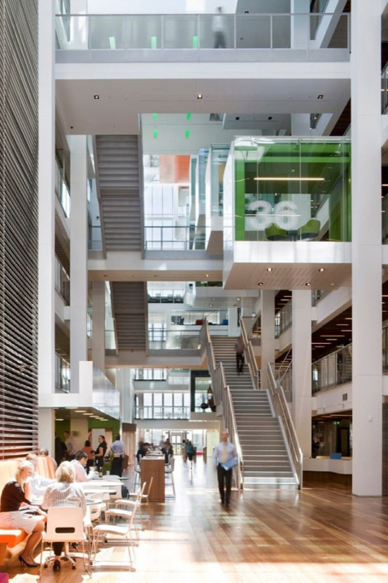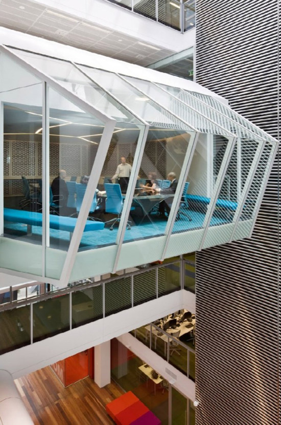 Просторный атриум с кафе и зонами отдыха на первом этаже открывает вид на многоуровневые рабочие пространства и яркие ячейки комнат переговоров, соединенные удобными лестничными развязками, что позволяет сокращать использование лифтов на 50%.